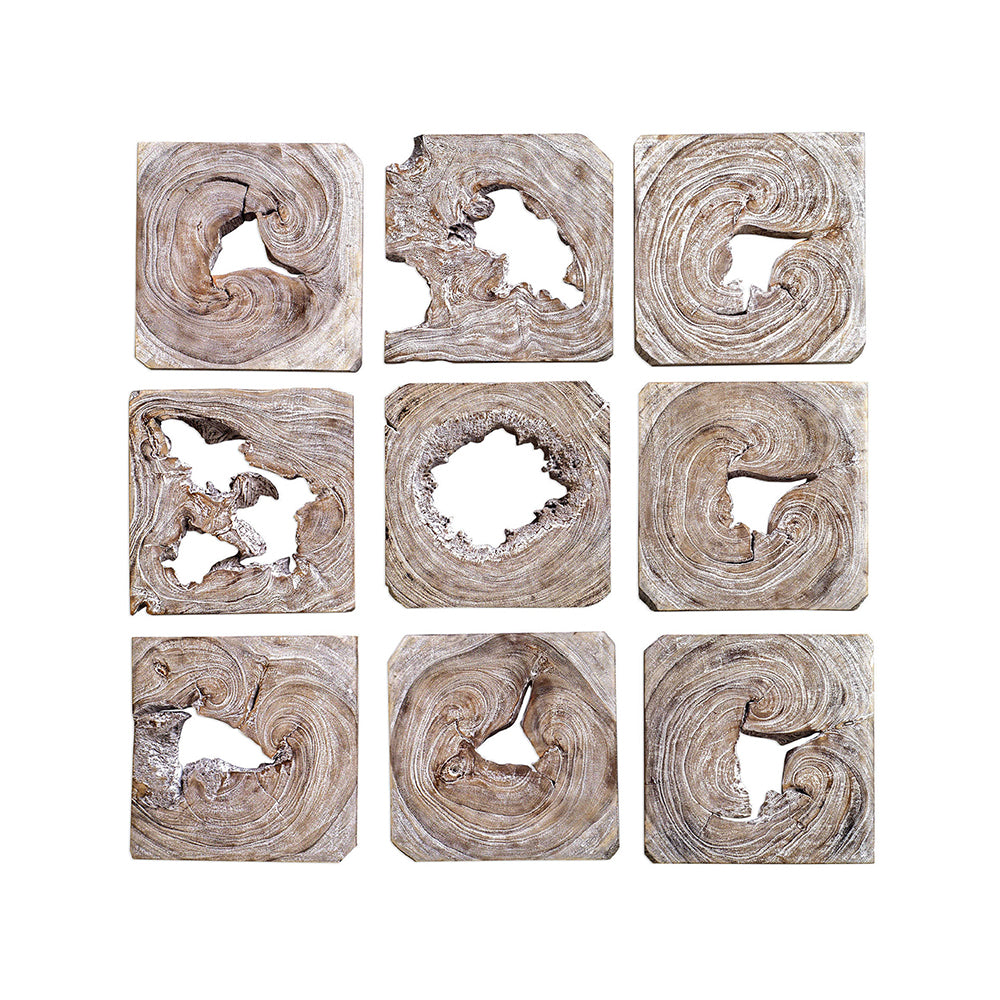 This set of 9 wood wall art features solid natural suar wood finished in whitewashed ivory with coffee brown undertones. Because each is individually handcrafted, natural variation will occur from piece to piece.