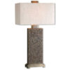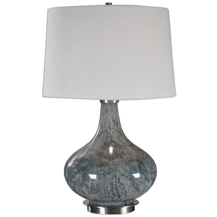 - Mottled, light blue gray glass accented with plated brushed brass details. The slightly tapered round hardback shade is an ivory linen fabric with light slubbing.