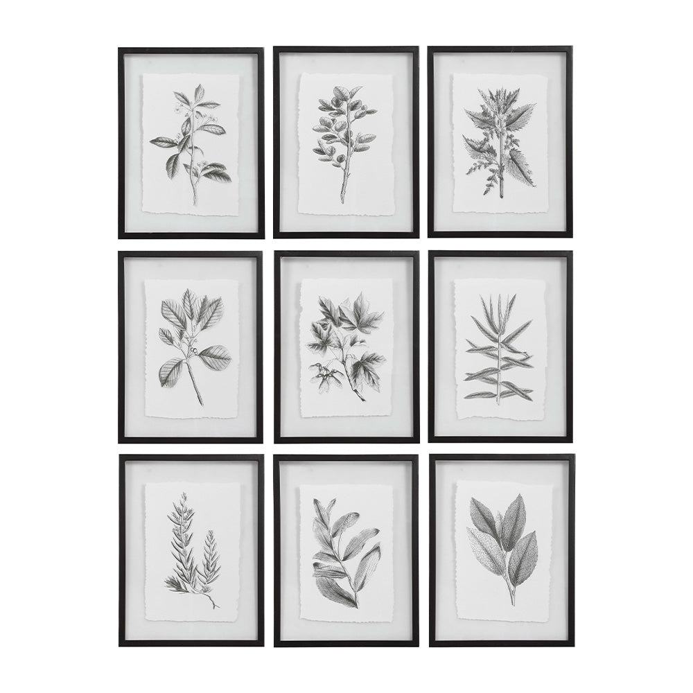 A more modern take on classic botanical prints, this set of artwork showcases a classic black and white theme with deckled edges. Each print is placed under glass and accented by a petite matte black finished frame.