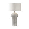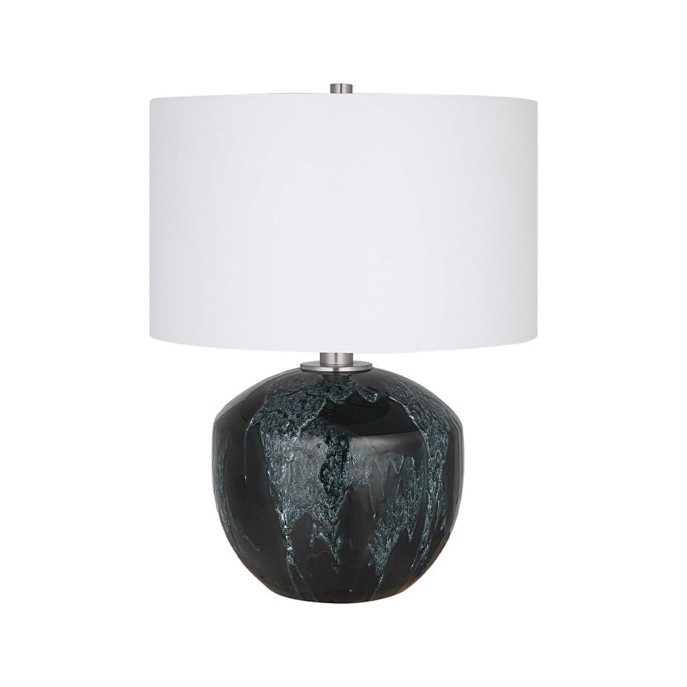 This ceramic table lamp features a deep emerald green drip glaze with subtle ivory undertones paired with brushed nickel-plated details. A white fabric drum shade completes the piece.