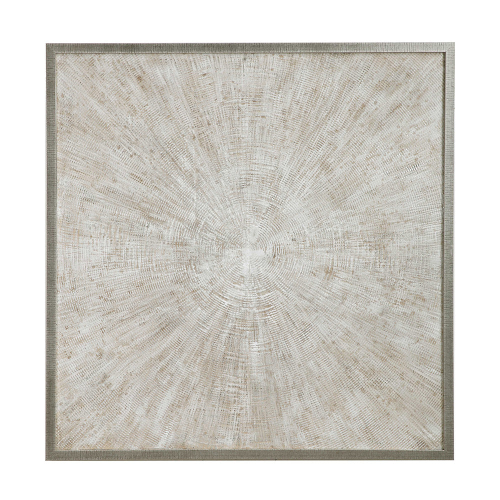 Hand-painted on canvas, this artwork features heavy texture with natural beige and white tones and metallic silver highlights. A textured antique silver gallery frame accents the piece. Due to the handcrafted nature of this artwork, each piece may have subtle differences.