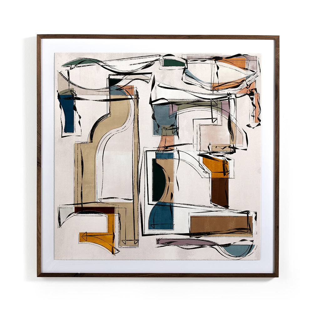 A shapely, abstract work by Bangkok-based art house Coup D’Esprit. Framed within rustic walnut for a gallery-quality look. Handmade in Austin, Texas.
