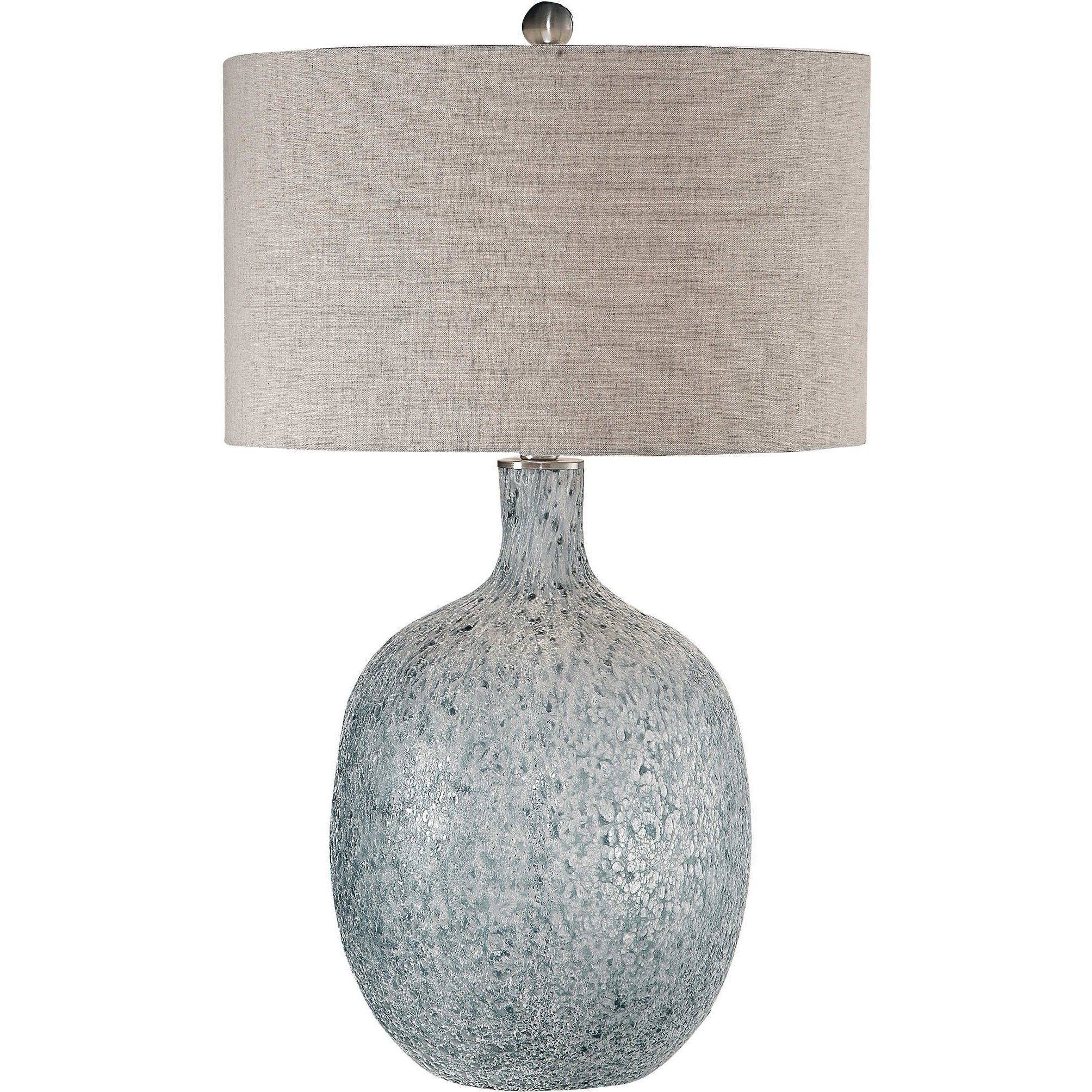 - The finish on this glass base is reminiscent to an ocean wave crashing, featuring mottled highlights of blue green, covered in a heavily textured aged white glaze, paired with brushed nickel plated details. The round hardback drum shade is a light beige linen fabric with natural slubbing.