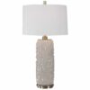 - Finished in an antiqued brushed brass, this table lamp keeps it simple yet upscale with a large metal cylinder base with matching accents. The hardback drum shade is finished in a beige linen fabric.