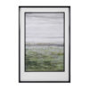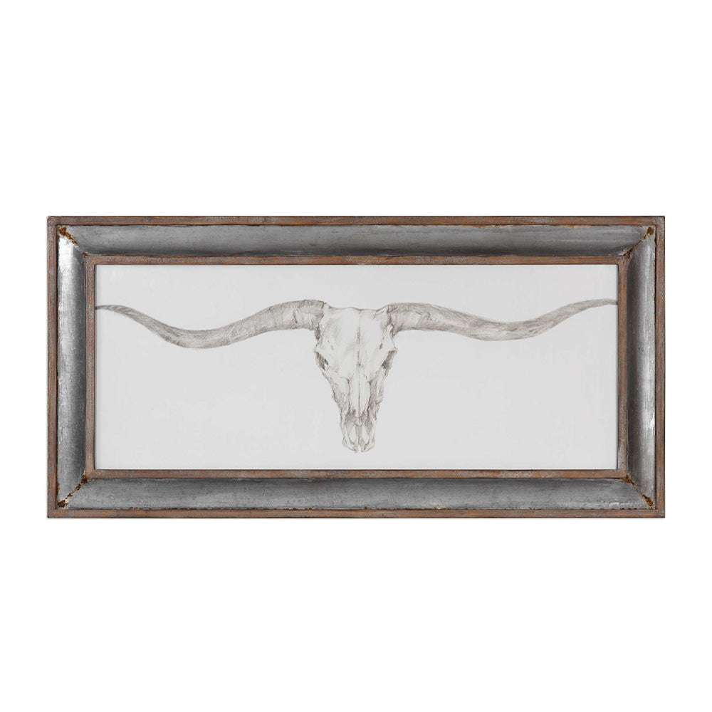 Rustic, western style radiates from this framed, monochromatic artwork. This simple, masculine design is surrounded by a galvanized tin frame with rust accents and a distressed barn wood outer frame and inner lip. This transitional print is placed under protective glass. Artwork by Ethan Harper.